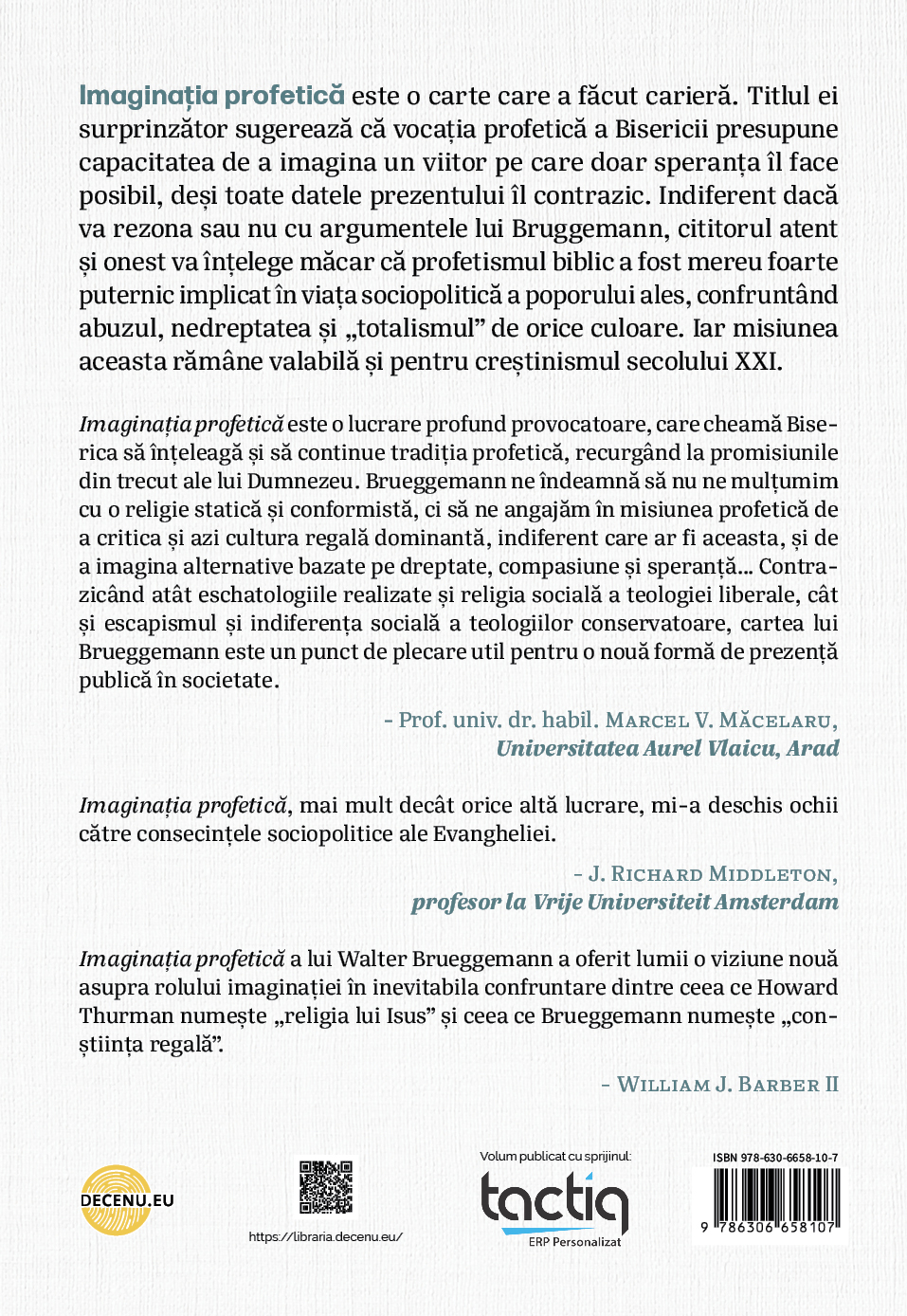 Imaginația profetică este o carte care a făcut carieră. Titlul ei surprinzător sugerează că vocația profetică a Bisericii presupune capacitatea de a imagina un viitor pe care doar speranța îl face posibil, deși toate datele prezentului îl contrazic.